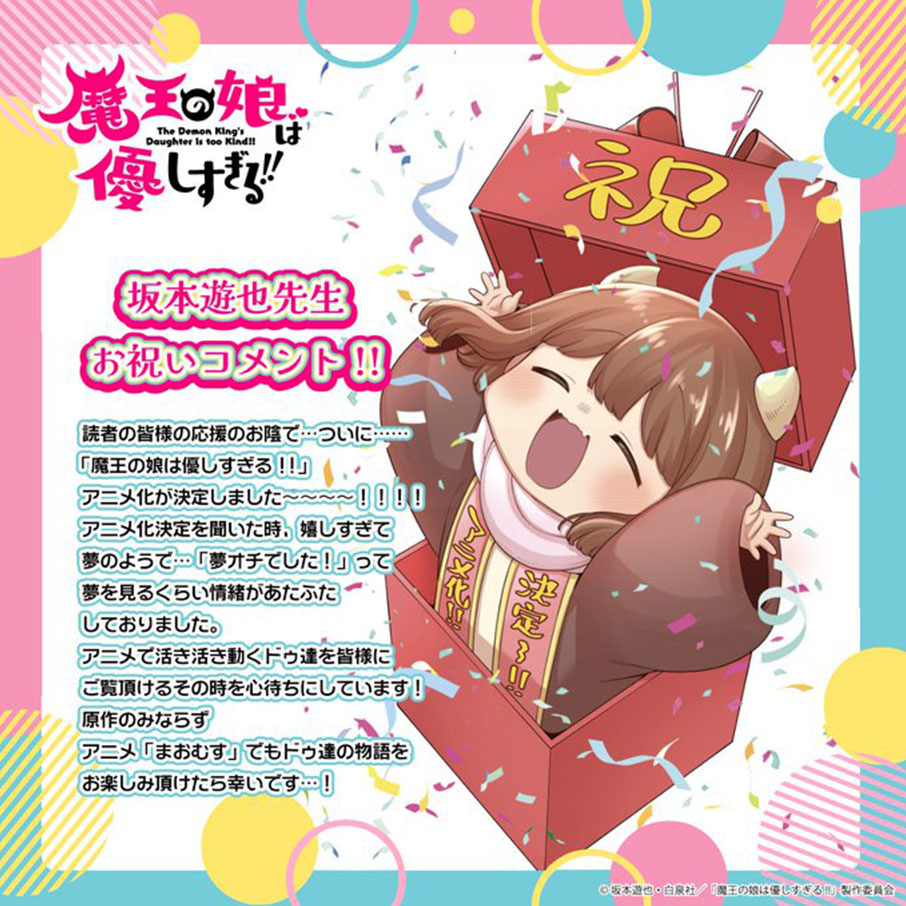代表作『魔王の娘は優しすぎる!!』(KADOKAWA刊)のアニメ化が決定。