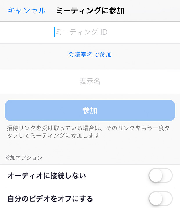 専用の「ミーティングID」をお伝えしますので、ダウンロードしたアプリを起動し、「ミーティングに参加する」を選択。